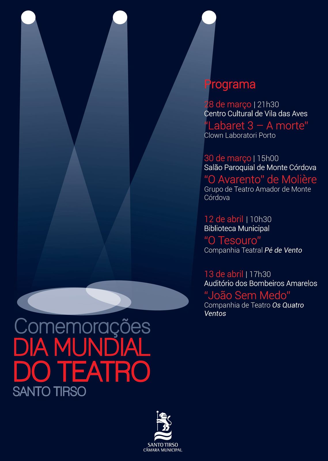 A Câmara Municipal de Santo Tirso vai assinalar as comemorações do Dia Mundial do Teatro com um ciclo composto por quatro peças teatrais. «Labaret 3 – A morte», da companhia Clown Laboratori Porto, «O Avarento», de Molière, «O Tesouro», conto de Manuel António Pina, e «João Sem Medo», com textos de José Gomes Ferreira, sobem a diferentes palcos de equipamentos culturais do concelho, entre 28 de março, sexta-feira, e 13 de abril. Uma programação “eclética” que também aposta na produção local. Todos os espetáculos têm entrada gratuita.