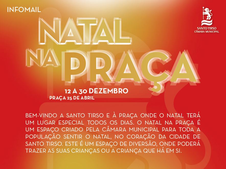 O presidente da Câmara Municipal de Santo Tirso, Joaquim Couto, vai assinalar amanhã, sexta-feira, pelas 15h00, o arranque do “Natal na Praça”. A Casa do Pai Natal, a Cozinha de Natal, a Fábrica de Embrulhos, Passeios de Charrete ou Pinturas Faciais vão animar, durante as próximas duas semanas, a Praça 25 de Abril (em frente aos Paços do Concelho), onde estará localizado este grande espaço de diversão, dedicados a pequenos e graúdos. A entrada é livre.